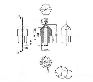 - Materijal: mesing (brzo provodi toplotu, ujednačeno topljenje filamenta)
