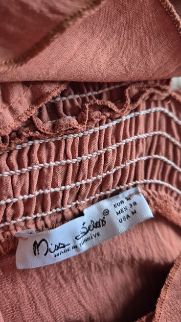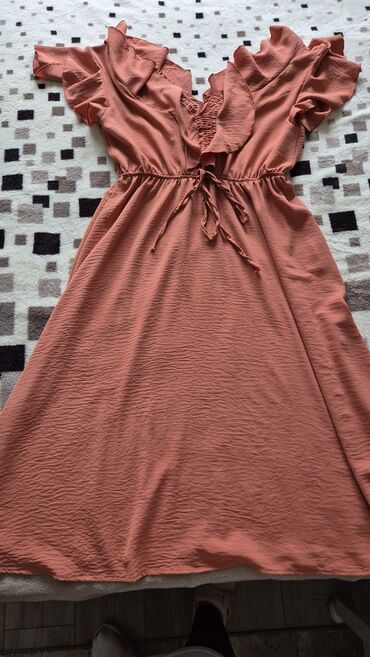 Midi haljina u boji breskve sa volanima, idealna za prolećne i letnje dane. Karakteriše je V-izrez sa ukrasnim naborima i elastični struk sa učkurom za podešavanje, što omogućava udobno pristajanje. Kratki rukavi su takođe ukrašeni volanima, dodajući ženstveni šarm. Materijal ima blagu teksturu, dajući haljini opušten i prozračan izgled, savršen za svakodnevno nošenje ili ležerne prilike.