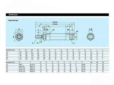 - Mogućnost izbora prečnika cilindra (ø16, 20, 25, 32, 40 mm – dimenzije i navojni standardi prikazani u priloženoj tabeli)
