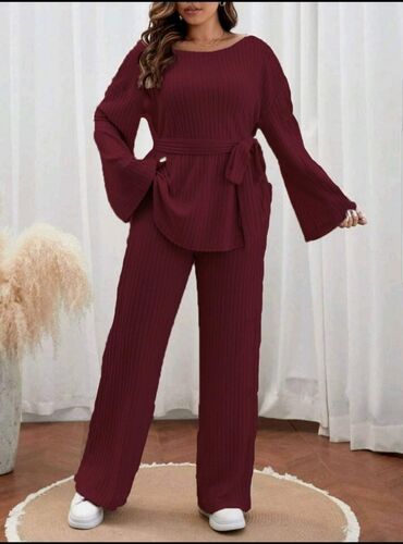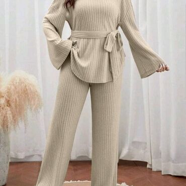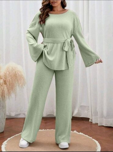 Dvodijelni ženski pleteni komplet – duks i pantalone širokih nogavica. - Materijal: mekani pleteni triko, elastičan i udoban za celodnevno nošenje. - Gornji deo: ravni okrugli izrez, spuštena rame...