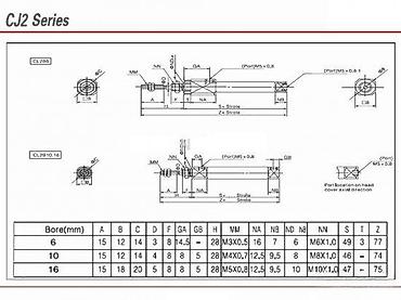 Napomena: Na drugoj slici je tehnička tabela i skica sa tačnim mernim vrednostima i rasporedom portova za CJ2 seriju; odaberite hod i gabarite prema potrebi aplikacije.