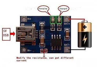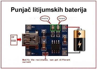 Napomena: LED označene na pločici prikazuju “charging” i “charged”. Promenom otpornika moguće je dobiti različitu struju punjenja.