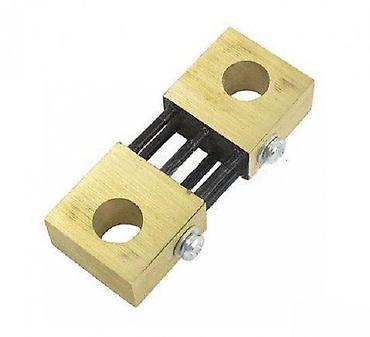 - Konstrukcija: masivne mesingane krajnje stege sa velikim otvorima za zavrtnje/priključke; između njih više paralelnih otpornika (šine) od specijalne legure za stabilan otpor