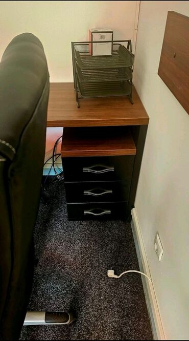 Radni sto sa stolicom – moderan set za kućnu kancelariju. Sto 7500 I stolica 3500 din. Mogu se kupiti I odvojeno. - Sto pravougaonog oblika sa radnom površinom u dekoru svetlog hrasta - Crni metal...