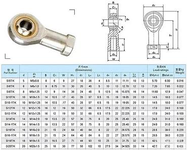 - Prečnik kugle (d): 5–20 mm (npr. SI5TK, SI6TK, SI8TK, SI10TK, SI12TK, SI14TK, SI16TK, SI18TK, SI20TK)