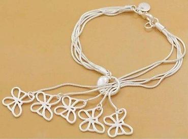 - Dizajn: višeslojna “snake” lančana narukvica sa centralnim elementom iz kog vise 5 privjesaka u obliku leptira