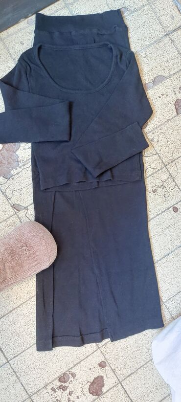 Komplet 2500 dinara Uni velicina S M L - Dvod elni komplet od rebrastog, elastičnog pletiva - Uska midi haljina na bretele sa V-izrezom, prati liniju tela - Krojen dugi, širi kratki džemper sa okru...