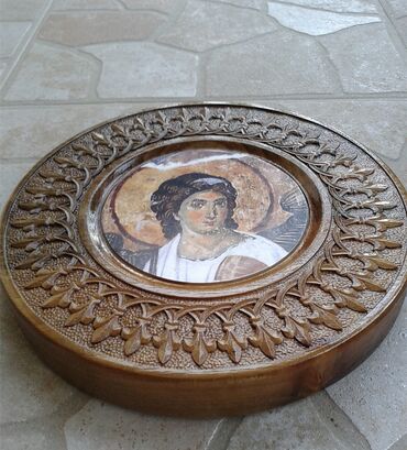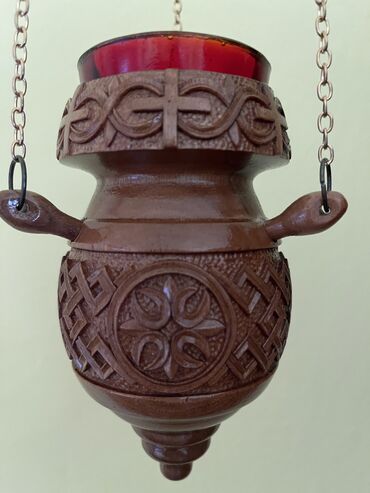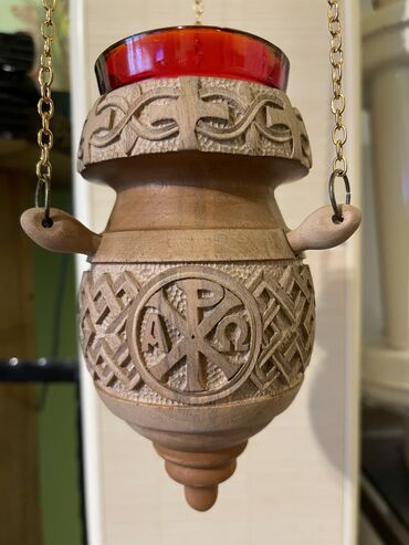 Ručno rezbarena viseća kandila od drveta sa staklenom čašicom + dekorativni zidni tanjir sa ikonografskim motivom. - Materijal: puno drvo, ručna rezbarija; gornji uložak od crvenog stakla. - Dizaj...+381 64 29629xx