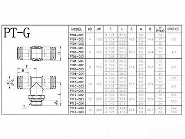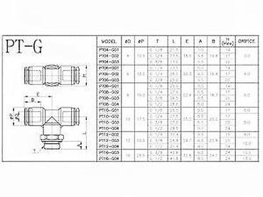 - Dijagram sa dimenzijama i dostupnim modelima: PT-G serija (modeli npr. PT04–G01/G02/G03, PT06–G01/G02/G03, PT08–G01/G02/G03, PT10–G01/G02/G03, PT12–G03/G04, PT16–G03/G04). U tabeli su navedeni prečnici cevi (øD), veličina navoja (G 1/8, G 1/4, G 3/8, G 1/2), ukupne mere (T, L, E, A, B, H) i prečnik prolaza (Orifice).