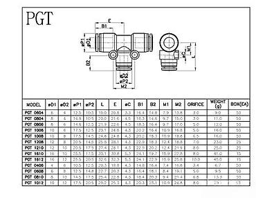 - Dostupni prečnici cevi: 4, 5, 6, 8, 10, 12, 16 mm (modeli npr. PGT 0604, 0804, 0806, 1006, 1008, 1208, 1210, 1610, 1612, 0406, 0608, 0810, 1012)