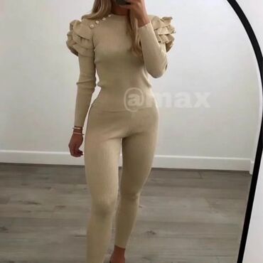 Pleten komplet (džemper i pantalone) u svetloplavoj nijansi. - Gornji deo: rolka sa širokim rebrastim ovratnikom, opušten kroj, blago talasasti porub. Rukavi ukrašeni nizom dekorativnih dugmadi u ...3 500 RSD