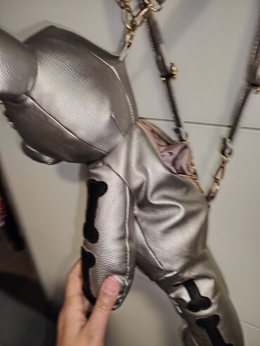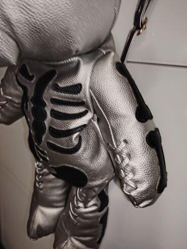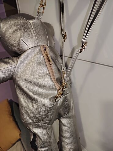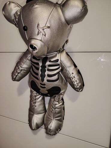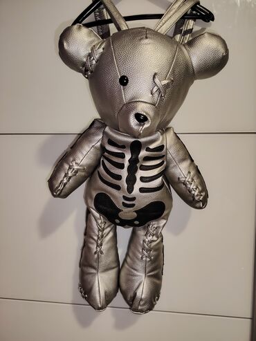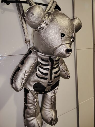 Unikatni ranac u obliku plišanog medveda – metalik srebrna boja sa crnim aplikacijama kostura.