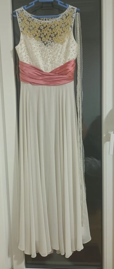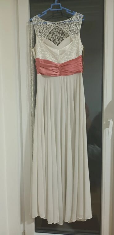 - Boja: pretežno bela/šampanj, sa ružičastim satenskim pojasom u struku