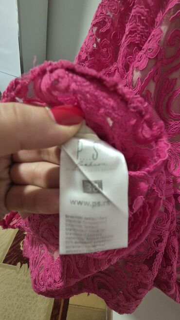 - Detalji: dekorativni čipkani motivi sa cvetnim i ornamentalnim šarama; diskretan metalni bedž „PSC“ na struku