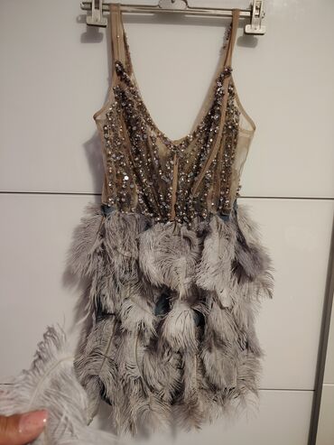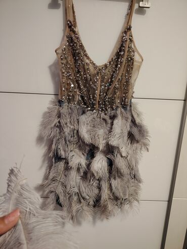 Koktel/večernja mini haljina Iv ice sa perjem i ručno našivenim kristalima. Haljina je nošena dva puta i ispala su 3 pera, pera se mogu kupiti u istoj nijansi u "Pozamanteriji" u Beogradu, po ceni od oko 1000 paket sa 10 pera, zbog toga je cena drastično snižena.