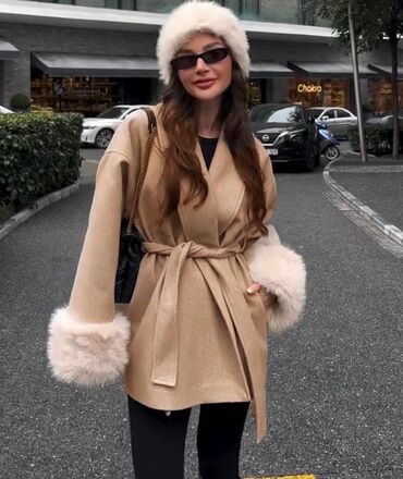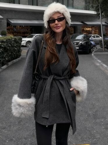 Ženski kratki kaput sa pojasom i krznenim manžetnama