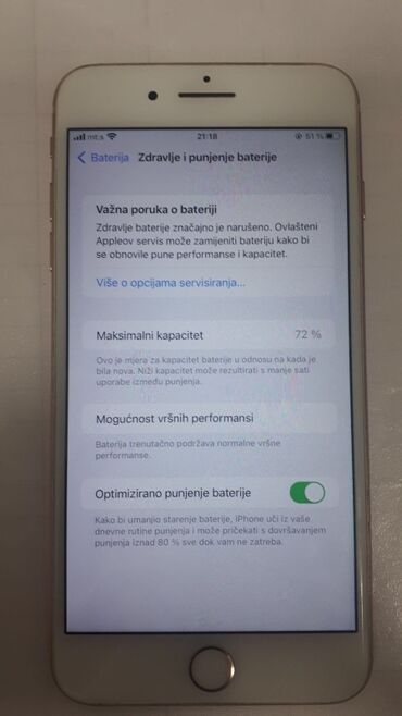 - Prikaz stanja baterije na uređaju: poruka o potrebi servisa; maksimalni kapacitet 72%; omogućeno optimizovano punjenje baterije