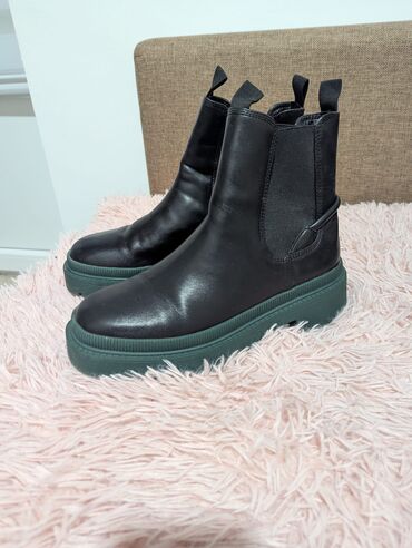 KožaCrne kožne Chelsea čizme sa povišenim gumenim đonom u tamnozelenoj boji.