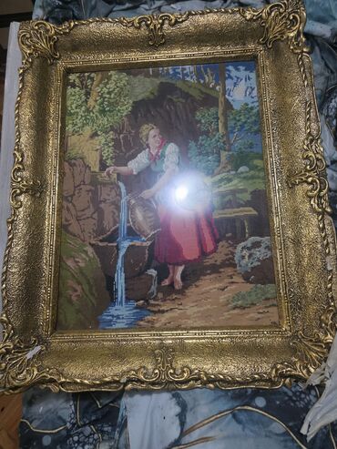Ručno rađene goblene u bogatim pozlaćenim ramovima Opis: - Set od dva velika goblena, pažljivo izrađena sitnim bodom. - Motiv 1: Pastoralna scena – devojka pored izvora, prirodni pejzaž sa stenama...