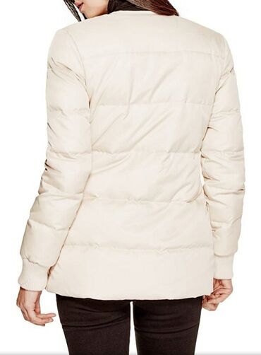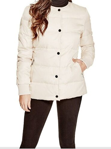 Guess bež ženska perjana jakna. Jakna je veličine S (36). Spoljašnji deo jakne je 100% nylon, postava je ćebasta meka (100% poliester) punjenje je 65% paperja i 35 % perja, kopča se dugmicima (u obliku nitne), na džepovima su rajfešlusi.Jakna je blago strukirana bez kragne i pogodna je za sve kombinacije i spada u tanji model perjanih jakni(kraj zime i početak proleća).Nova sa etiketom.