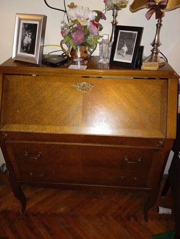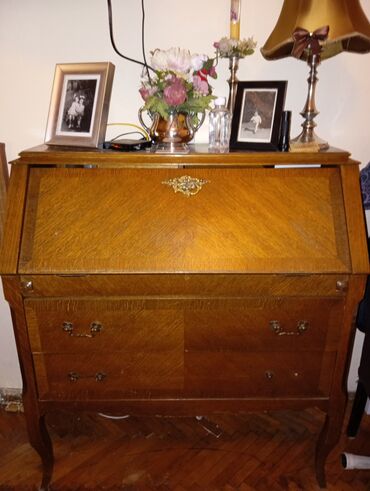Masivni drveni kancelarijski sto sa rolo-zatvaračem (roll-top). - Materijal: puno drvo, tamno bajcovano, sa izraženom teksturom. - Gornji deo: rolo mehanizam koji se spušta i zaključava radnu povr...