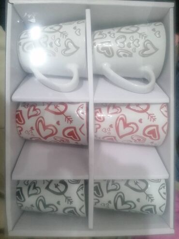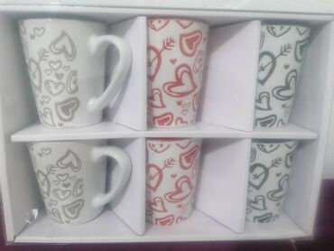 - Dizajn: bele šolje sa romantičnim motivima srca i strelica u tri boje otiska – siva, crvena i tamnosiva (po dve šolje svake boje).