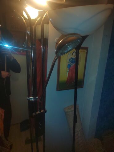 - Dve visoke podne lampe sa teškim okruglim postoljem (jedna metalik, jedna crna).