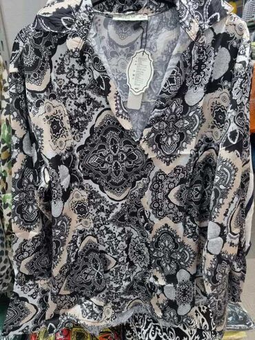 - Model 1: Crno‑siva košulja sa bogatim paisley/ornamentalnim printom. Klasičan kragnasti okovratnik, dug rukav, blago V-izrezano kopčanje sprijeda sa skrivenim dugmadima. Tkanina lagana i prijatna na dodir, pogodna za svakodnevno nošenje i kombinovanje uz farmerke ili elegantne pantalone.