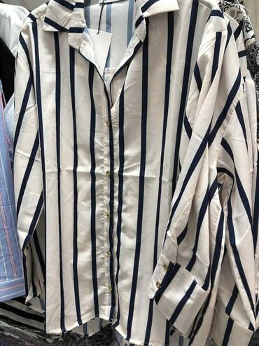- Model 2: Prugasta košulja u beloj boji sa tamnoplavim vertikalnim prugama. Klasičan kragnasti okovratnik, ravno kopčanje sa zlatnim dugmadima, manžetne sa dugmadima, dugi rukavi. Kroj opušten, ravnog pada, idealna za poslovne i ležerne kombinacije.