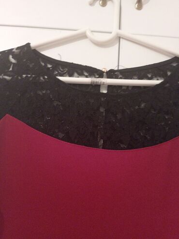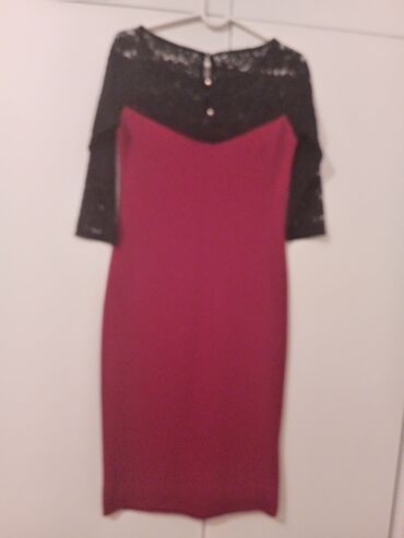 Drugi materijalElegantna haljina u dvobojnoj kombinaciji: bordo telo i crni čipkani gornji deo.