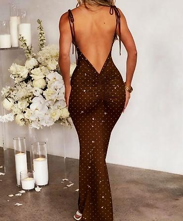 Haljina duga gola ledja napred dekolte pada sa bratelama trakama za vezivanje.Pozadi nabrana push up.Tamno braon boja sa šljokicama.Ima postavu i elastin.XXS,XS,S,M,L,XL,2XL,3XL,4XL,5XL 1500 NOVO AKCIJA