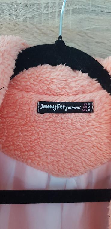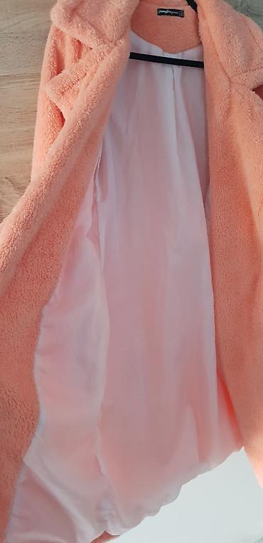 Ženski teddy kaput, breskva/losos roze boje. - Dužina: midi (ispod kolena) - Kroj: opušten, sa širokim reverima - Zatvaranje: bez vidljivih kopči (otvoren model) - Materijal: mekana „teddy”/plišan...