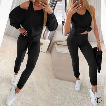LKomplet trodelni:donji deo trenerke u ranflu,gornji deo sirok pada na jedno rame sa trakom za stezanje u struku i majica na siroke bratele.