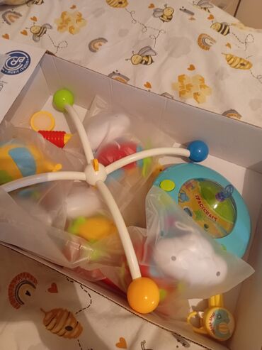 - Luk/ručka za montiranje na krevetac, više krakova sa šarenim kuglicama i kačenim igračkama.