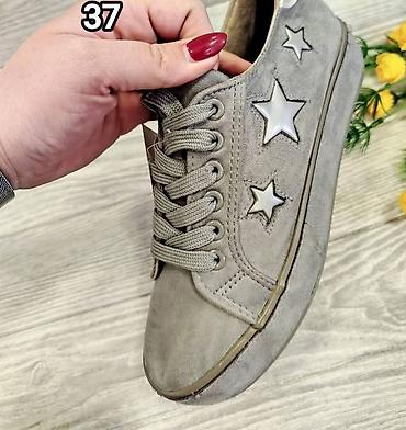 - Model 2: Patike od mekšeg materijala u sivoj boji sa ukrasnim aplikacijama zvezda sa strane. Klasično pertlanje sa metalnim ringlicama i gumeni đon u sivoj nijansi.