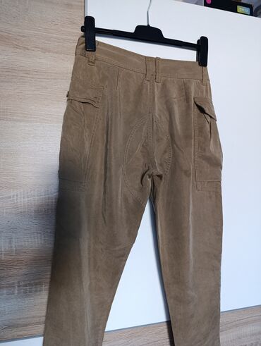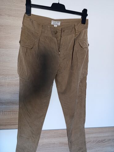 - Kroj i detalji: srednji struk, pertle za kaiš, prednje falte, rajsferšlus i dugme napred, dodatni bočni džepovi s preklopom i dugmetom, ojačan šav na zadnjem delu za bolju izdržljivost