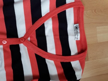 Pleten kardigan na dugmad, svetloplave boje sa belim cvetnim dezenom. V-izrez sa rebrastim porubom i kontrastnim belim prugama duž ivica i na manžetnama. Tri plava dugmeta napred, blago puf rukavi ...