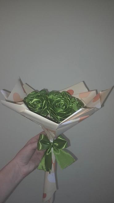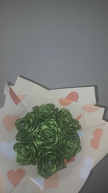 - Buket sastavljen od ručno pravljenih ruža od satenske trake u elegantnoj zelenoj boji.