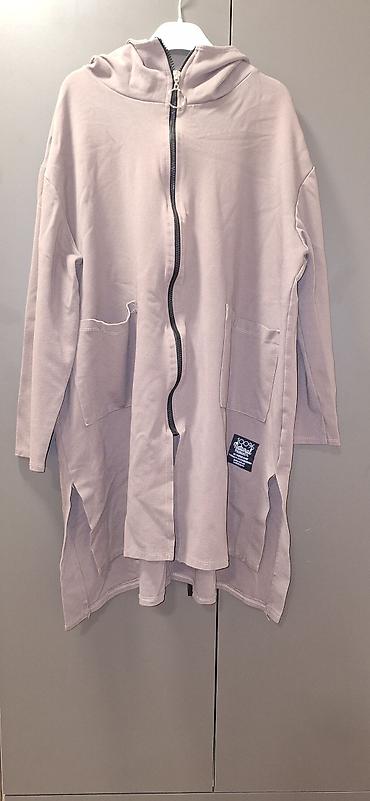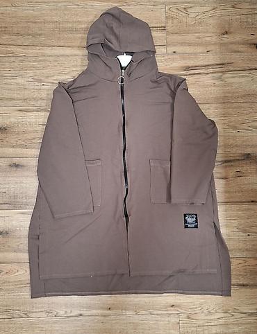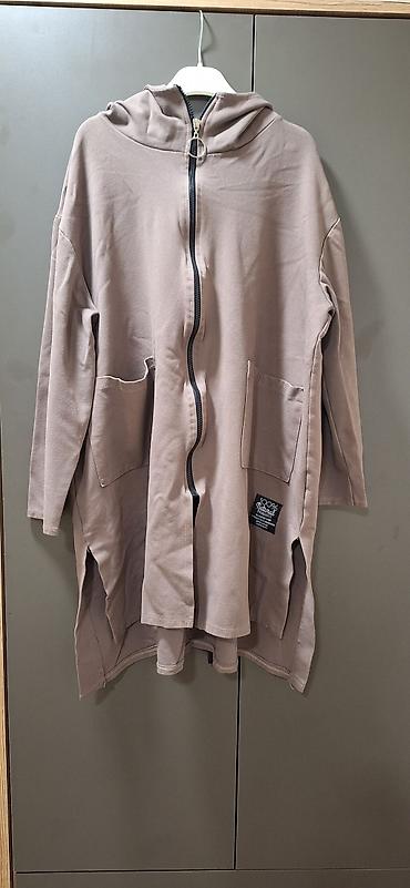 Dugačka ženska dukserica sa kapuljačom u sivo-braon nijansi. Ima rajsferšlus celom dužinom i dva džepa sa prednje strane. Donji deo dukserice je asimetričan, sa prorezima sa strane. Pogodna za nošenje u prelaznom periodu.