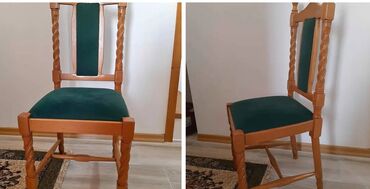 - Stolice: drveni ram sa spiralno rezbarenim nogama i naslonom; tapacirano sedalo i centralni deo naslona u tamnozelenom štofu/veluru za udobno sedenje