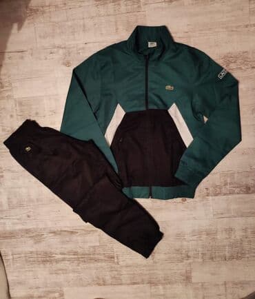 Muška trenerka brenda Lacoste, u kombinaciji tamnozelene, crne i bele boje. Gornji deo je jakna sa rajsferšlusom i visokom kragnom, dok donji deo čine crne pantalone sa elastičnim ranflama na nogav...