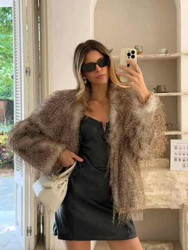 Ženska kraća jakna od veštačkog krzna – “shaggy” stil - Model: boxy/cropped kroj do kukova, široki rukavi, voluminozna tekstura sa kovrdžavim vlaknima. - Kopčanje: skriveno (prednji preklop bez vi...