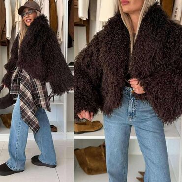- Model: boxy/cropped kroj do kukova, široki rukavi, voluminozna tekstura sa kovrdžavim vlaknima.