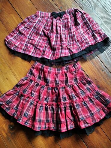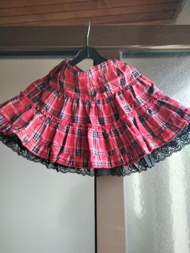 Dečja plisirana suknja na kockice - Veličina: 10–11 godina - Dužina: 47 cm - Širina struka: 28–35 cm (elastični pojas) - Boja/patent: tamna podloga sa belim i crvenim karo šarama - Detalji: čipkan...