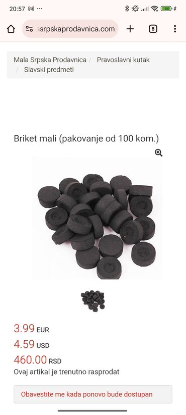 - Pakovanje: papirna kesica sa ojačanim zatvaranjem; vizuelno obeležena motivima crkvene opreme i natpisom „Брикет“.