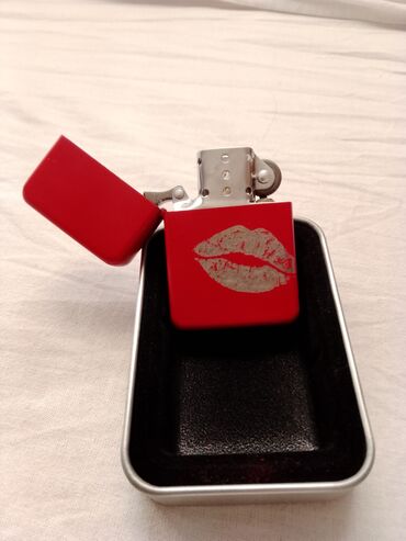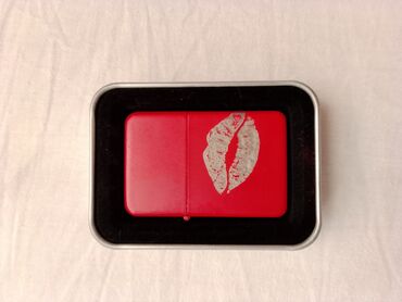 Zippo upaljačMetalni benzinski upaljač, klasičnog “flip-top” dizajna sa točkićem i komorom sa rupicama. Kućište je u mat crvenoj boji sa dekorativnim srebrnim otiskom usana na prednjoj strani. Dolazi u zaštitnoj metalnoj kutiji sa postoljem od crne pene. Mehanizam na oprugu za lako otvaranje jednom rukom; koristi standardni benzin za upaljače i kremen. Kompaktan i težak u ruci, pogodan kao aksesoar ili poklon. Dimenzije približno: džepni format (standardna Zippo veličina).