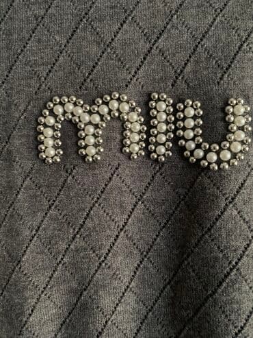 Sivi pleteni džemper sa suptilnim romb uzorkom po celoj površini. Na prednjem delu nalazi se dekorativni natpis „miu“ izrađen od malih metalnih kuglica u srebrnoj boji i bisernih perlica, koje form...