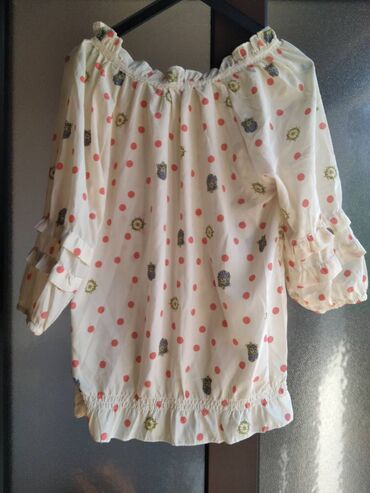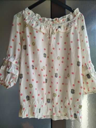 H&M ženska bluza sa peplum krojem - Model: bluza sa dugim rukavima i blagim peplum volanom oko struka - Boja/osnova: bela - Šara: tufnice u crvenoj i tamnoplavoj boji - Izrez: okrugli - Kopčanje: ...