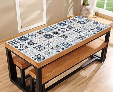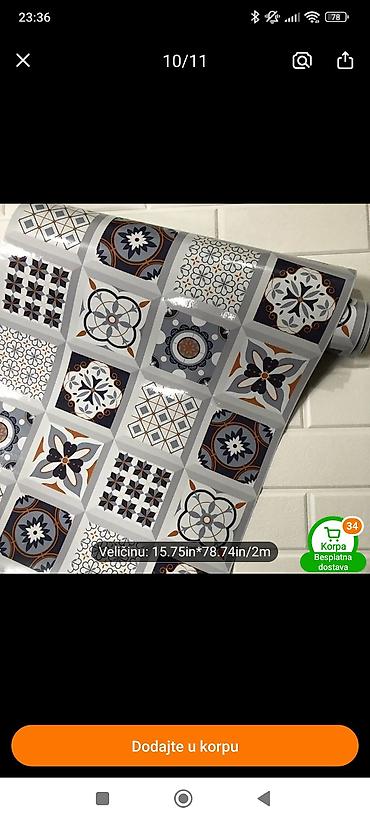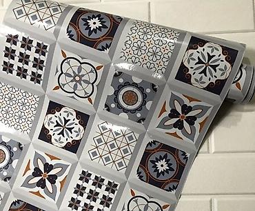 - Dekorativna samolepljiva folija koja imitira keramičke pločice u kvadratima sa raznim orijentalnim i geometrijskim motivima u sivim, plavim, crnim i oker tonovima.