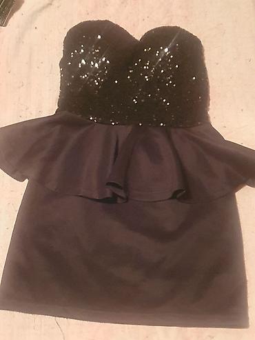 - Mini haljina bez bretela sa srcastim dekolteom: gornji deo prekriven šljokicama, ispod struka peplum volan koji naglašava figuru, uska suknja ravne linije.